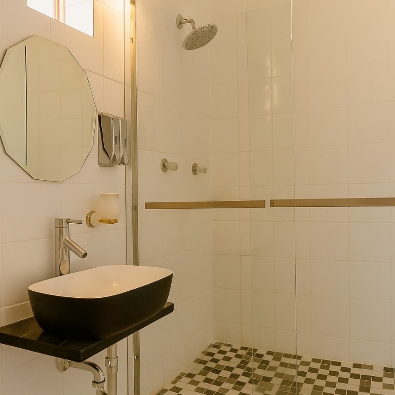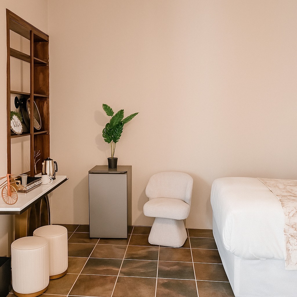 1 double bed (ideal for couples or solo travelers). A shared kitchen for self-catering and a bar and restaurant for in-house catering.